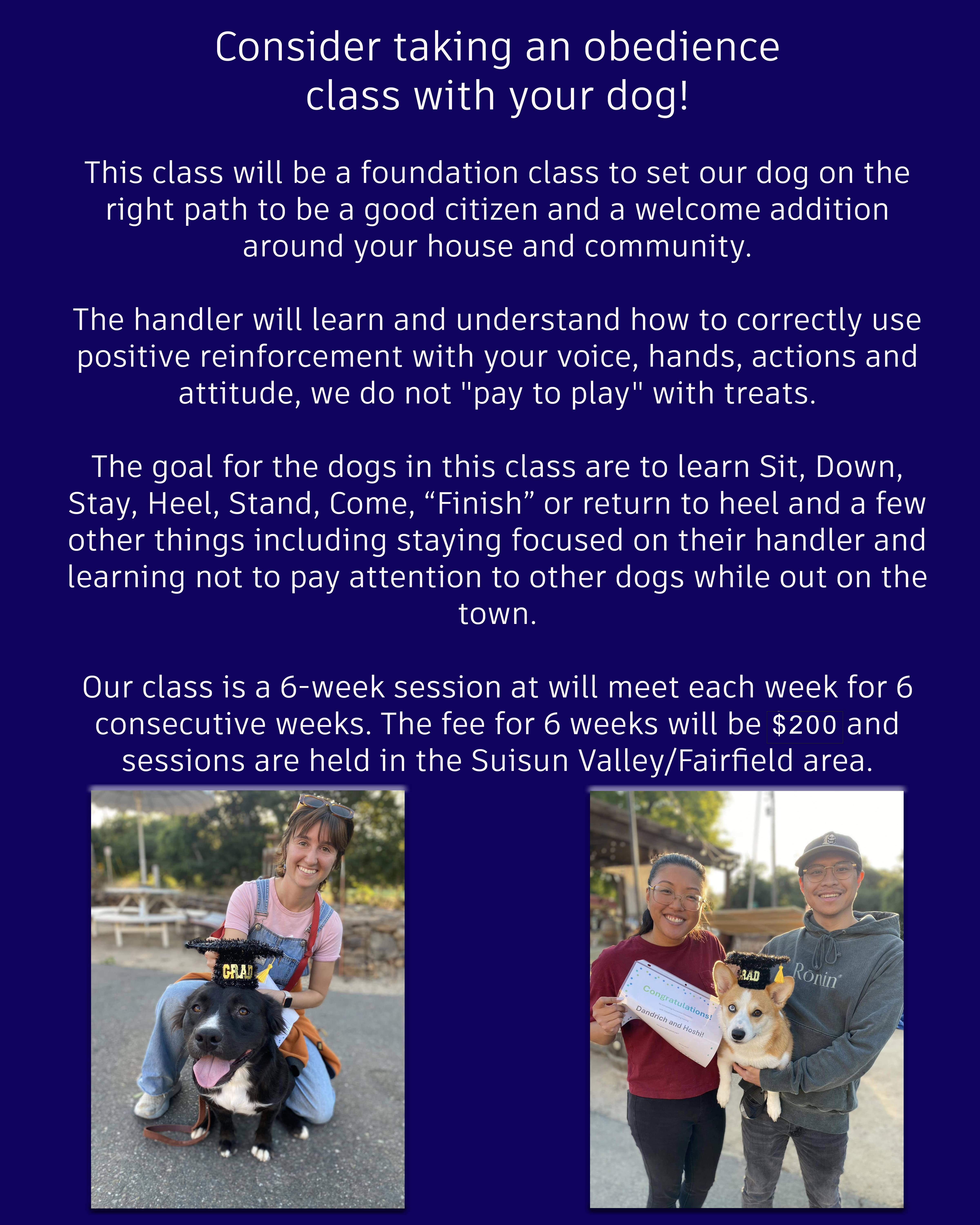 I offer a $50 discount for dogs in beginning obedience if you have adopted your dog from a shelter or rescue to help encourage training with your new companion!